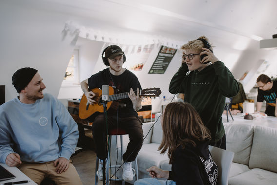Spannend wird es, wenn Melodie und Text miteinander verbunden und die ersten Aufnahmen gemacht werden. Da zu einem runden Song Strophen, Chorus, Pre-Chorus und Bridge gehören, bieten sich viele Möglichkeiten für die Teilnehmenden verschiedene Instrumente einzuspielen und den eigenen Gesang aufzunehmen.